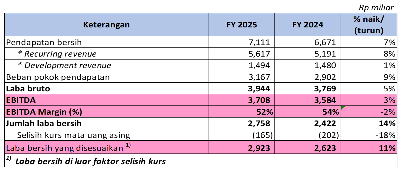 PT Pakuwon Jati Tbk (PWON) kembali mencatatkan kinerja yang tangguh selama 2025, mencerminkan kekuatan model bisnis yang terdiversifikasi serta strategi jangka panjang yang solid. Perseroan membukukan pendapatan bersih untuk 2025 sebesar Rp 7,11 triliun, meningkat 7% dibandingkan tahun sebelumnya sebesar Rp 6,67 triliun. Laba kotor tercatat sebesar Rp 3,94 triliun, naik 5% dibandingkan Rp 3,77 triliun pada tahun sebelumnya, sementara mencatat EBITDA sebesar Rp 3,71 triliun, dimana meningkat 3% dari Rp 3,58 triliun pada tahun sebelumnya. Laba Bersih mengalami pertumbuhan sebesar 14% dari Rp 2,42 triliun pada tahun sebelumnya menjadi Rp 2,76 triliun, mencerminkan disiplin eksekusi serta kemampuan Perseroan dalam terus menciptakan pertumbuhan berkelanjutan sekaligus membangun legacy jangka panjang.