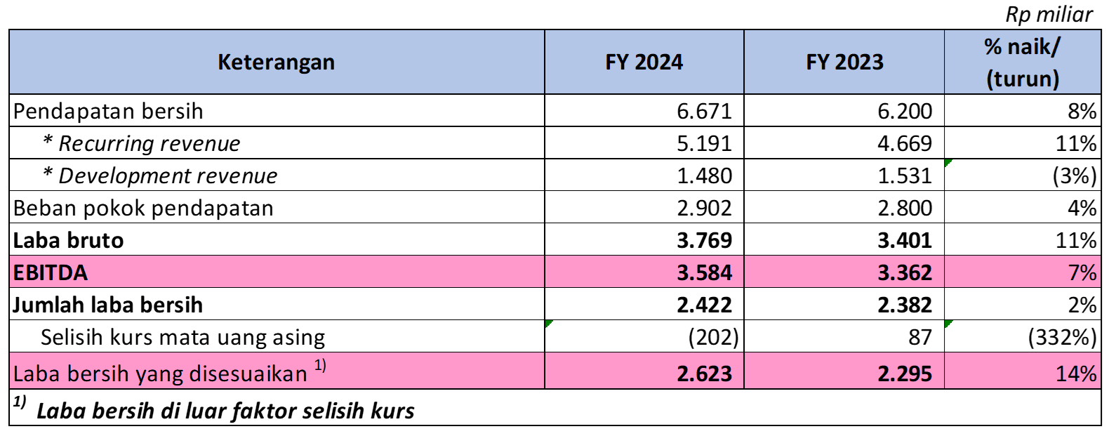PT Pakuwon Jati (PWON) membukukan pendapatan bersih untuk tahun 2024 sebesar Rp 6,67 triliun, naik 8% dari tahun sebelumnya yang sebesar Rp 6,20 triliun. Laba Bruto tercatat sebesar Rp 3,77 triliun, naik 11% dibanding tahun sebelumnya sebesar Rp 3,40 triliun. EBITDA sebesar Rp 3,58 triliun, naik 7% dibanding tahun sebelumnya sebesar Rp 3,36 triliun. Laba Bersih tercatat yang disesuaikan sebesar Rp 2,62 triliun, naik 14% jika dibandingkan dengan tahun sebelumnya sebesar Rp 2,29 triliun.